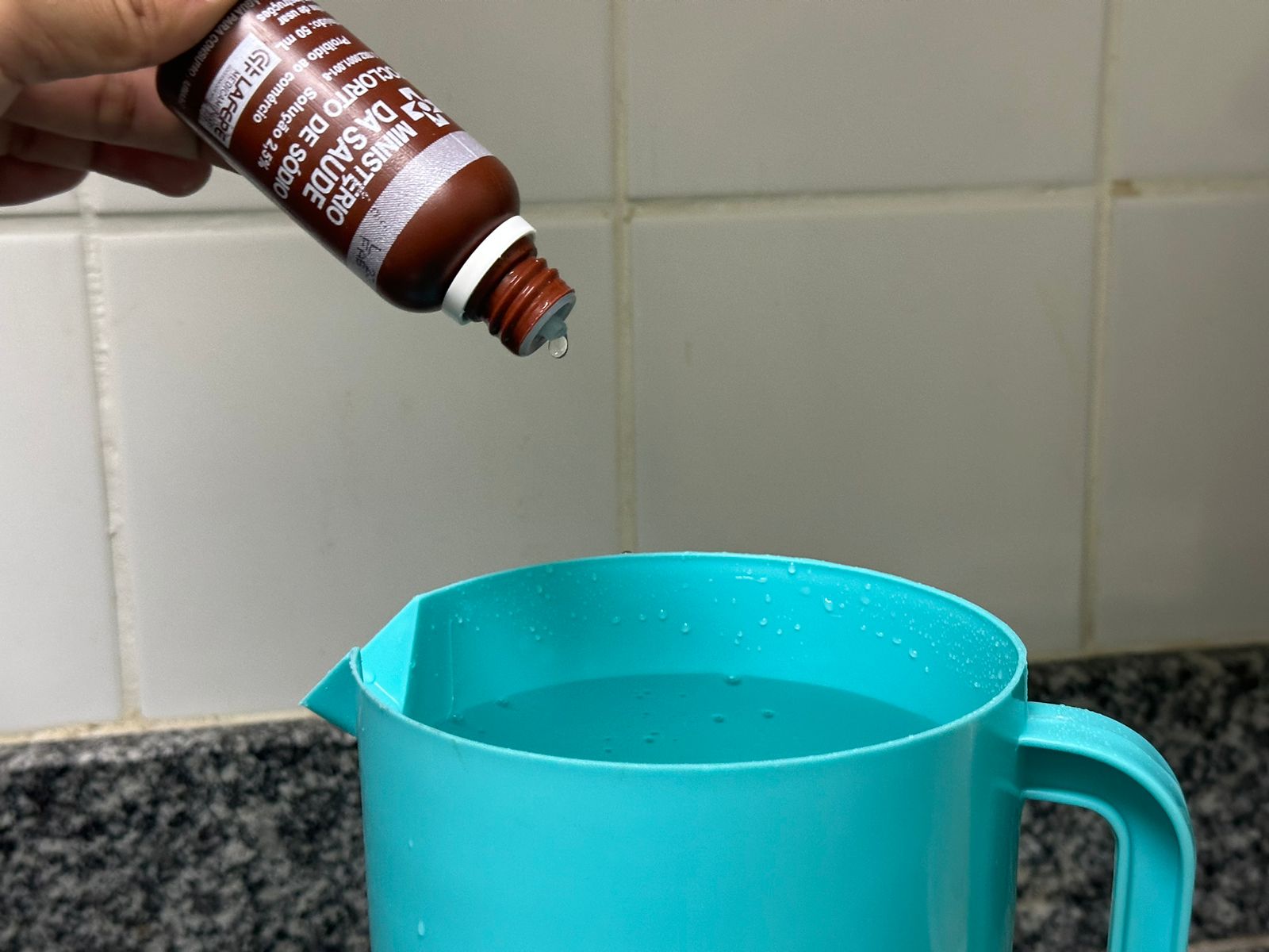 Meça a Quantidade de Água: Determine a quantidade de água que você deseja purificar. Para esse passo a passo, usaremos a medida de 1 litro de água. É recomendado, primeiramente, realizar a filtração da água a ser tratada, utilizando filtro doméstico, coador de papel ou um pano limpo.Adicione o hipoclorito de sódio: Para cada litro de água, adicione 2 gotas de hipoclorito de sódio (2,5%). Se você estiver purificando 10 litros de água, adicione 20 gotas.