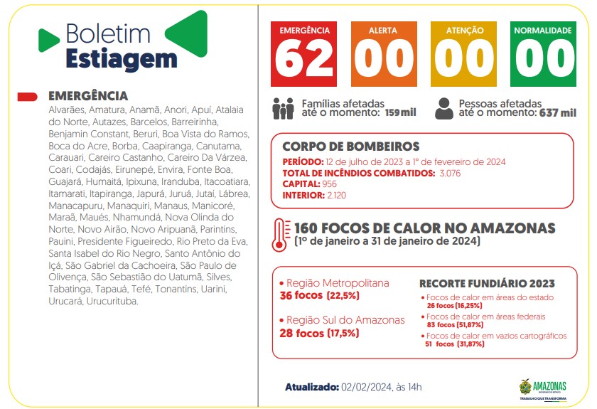 Esses números são atualizados e corrigidos diariamente, podendo sofrer alterações para mais ou para menos, de acordo com os ajustes realizados pelas autoridades municipais, visando a precisão dos dados. O Comitê foi instituído pelo governador Wilson Lima, no dia 29 de setembro. O governador também anunciou medidas para reforçar as ações do Governo, que já estão em andamento, por meio da operação Estiagem 2023.