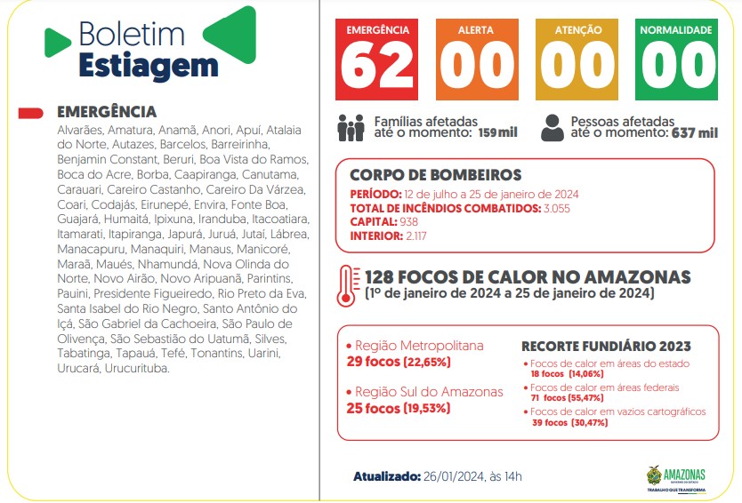 2O Governo do Amazonas, por meio do Comitê Intersetorial de Enfrentamento à Situação de Emergência Ambiental, divulga o boletim com informações atualizadas sobre a estiagem no estado, desta sexta-feira, 26/01.