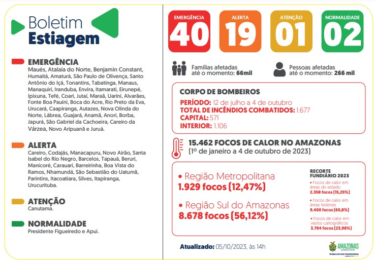 O Governo do Amazonas, por meio do Comitê de Intersetorial de Enfrentamento à Situação de Emergência Ambiental, divulga o boletim com informações atualizadas sobre a estiagem no estado, nesta quinta-feira (05/10).