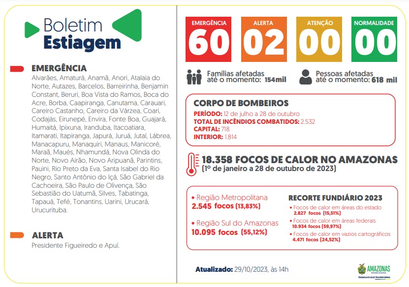 Até as 14h, havia 60 municípios em situação de emergência, 02 cidades em alerta, nenhum em atenção e nenhum em normalidade. Segundo o boletim, o Amazonas tem 618 mil pessoas afetadas até o momento pela seca severa, ou 154 mil famílias.