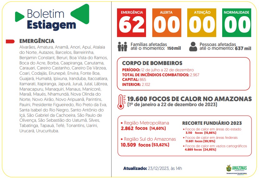 O Governo do Amazonas, por meio do Comitê Intersetorial de Enfrentamento à Situação de Emergência Ambiental, divulga o boletim com informações atualizadas sobre a estiagem no estado, neste sábado, 23/12.