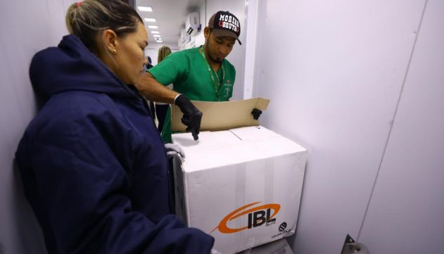As doses da bivalente chegaram por volta das 13h, no Aeroporto Internacional Eduardo Gomes e de lá foram escoltadas até a sede da Fundação de Vigilância em Saúde do Amazonas – Drª Rosemary Costa Pinto (FVS-RCP).