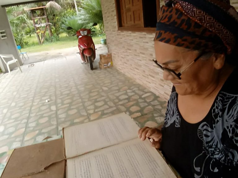 Nazaré Souza lendo o caderno de anotações da mãe, Maria Jardelina Nogueira,
