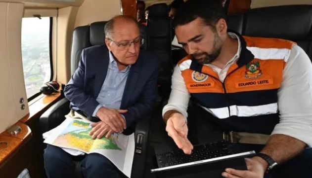 Geraldo Alckmin e Eduardo Leite sobrevoam regiões atingidas pelas chuvas