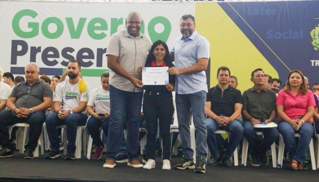 O governador Wilson Lima e o secretário executivo da Setemp, Paulo Gilson Ferraz, entregaram certificados para Dyanne Silva. A jovem realizou dois cursos ofertados na modalidade qualificação profissional voltados para o setor de serviços e comércio.