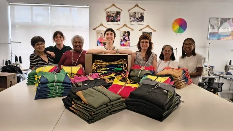 Marina Giongo transforma materiais de reuso em designs autorais, oferecendo oportunidade de renda para mais de 100 costureiras em Porto Alegre