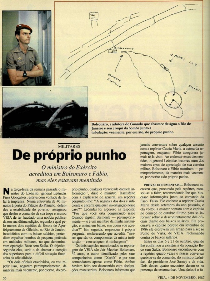 Por sua vez, a Veja entregou o croqui à perícia da Polícia Federal para que uma análise falasse por si. O resultado? Os peritos grafotécnicos confirmaram que o desenho tinha sido feito pela mão do oficial revoltado com os “baixos” salários. Havia outros pontos ainda na matéria que indignaram os generais da época, como o trecho em que Bolsonaro dizia que “nosso Exército é uma vergonha nacional, e o ministro (do Exército, à época general Leonidas Pires Gonçalves) está se saindo como um segundo Pinochet”.