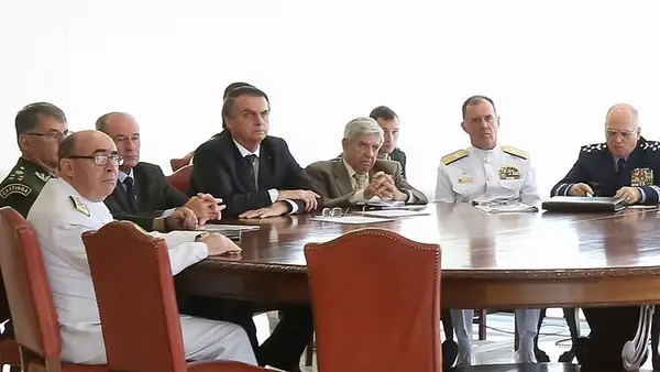 Além de Bolsonaro e os chefes de Marinha, Exército e Aeronáutica, aparecem na imagem General Heleno, exatamente ao lado do então presidente, e, logo atrás dele, Mauro Cid.