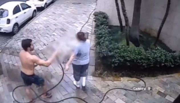 Imagens de câmeras de segurança mostram o momento em que um homem que passava pelo local arrancou a mangueira da mão dela e molhou-a. O suspeito também empurrou a faxineira, que acabou caindo.
