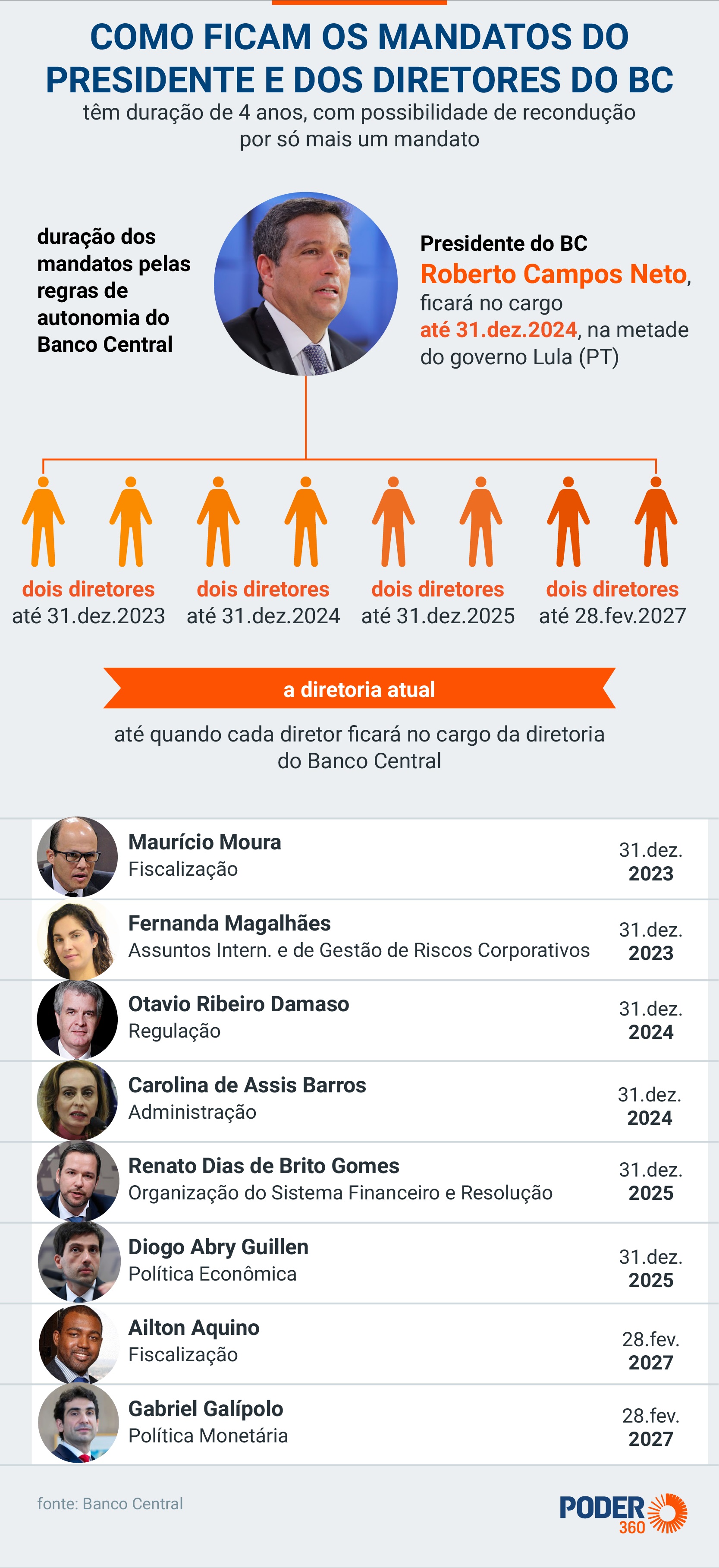 O BC tem 9 cadeiras, sendo 8 diretores e o presidente. Para obter maioria na autoridade monetária, Lula terá que trocar 5 nomes, o que só será possível depois de dezembro de 2024. Depois de autonomia do Banco Central, sancionada em fevereiro de 2021, a lei estabeleceu mandatos de 4 anos.
