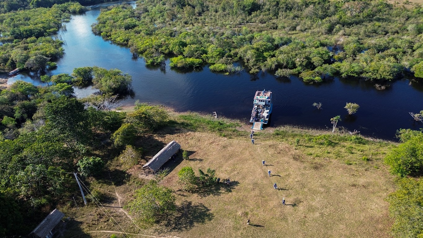 Nas comunidades ribeirinhas, como é o caso das aldeias, que ficam a duas horas de lancha rápida da sede do município, os equipamentos são levados de ferry boat, embarcação parecida com uma balsa, mas com pequeno calado para poder operar em águas rasas. Nos locais de difícil acesso, o material tem que seguir de voadeira para ser instalado.