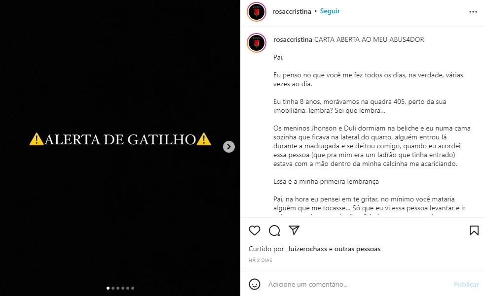 Rosa Cristina tinha apenas 8 anos de idade quando foi abusada pela primeira vez, segundo relatos que viralizaram nas redes sociais na última sexta-feira (17/6). Em postagem no Instagram, a influencer, moradora do DF, narrou que descansava na cama, dentro da própria casa, quando o suposto crime ocorreu. Ao lado, em um beliche, os dois irmãos mais novos dormiam.