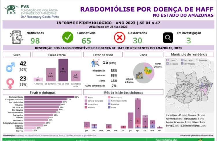 A FVS-RCP esclarece que a equipe do Centro de Informações Estratégicas em Vigilância em Saúde (Cievs) no Amazonas realiza rastreio, em parceria com as equipes de Vigilância Epidemiológica municipais, sobre a identificação dos casos que atendem à definição de caso suspeito de rabdomiólise compatível com a Doença de Haff, resultando no quantitativo de 65 casos compatíveis.
