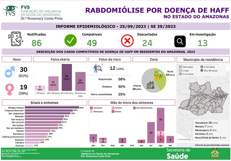 A FVS-RCP esclarece que a equipe do Centro de Informações Estratégicas em Vigilância em Saúde (Cievs) no Amazonas realiza rastreio, em parceria com as equipes de Vigilância Epidemiológica municipais, sobre a identificação dos casos que atendem à definição de caso suspeito de rabdomiólise compatível com a Doença de Haff, resultando no quantitativo de 49 casos compatíveis.