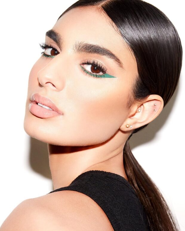 Se o delineado clássico já garante presença, a versão colorida multiplica esse efeito. Verde, azul, roxo, dourado ou vermelho podem transformar uma make simples em algo memorável. É uma forma rápida de entrar no clima festivo sem exageros. Para facilitar, escolha canetas delineadoras que deslizem com precisão. O traço pode ser fino ou mais gráfico, com cantos duplos e formatos ousados. Complete com blush suave e pele glow para um resultado harmônico.