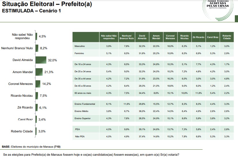 O levantamento entrevistou, presencialmente, 710 eleitores de Manaus, de 4 a 8 de maio de 2023. A margem de erro é de 3,7 pontos percentuais em um intervalo de confiança de 95%. A pesquisa não está registrada no TRE-AM (Tribunal Regional Eleitoral do Amazonas) e, portanto, não tem código. Eis a íntegra.