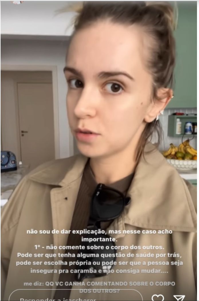 “Não se faz comentários sobre o corpo dos outros. Aprende isso. Igual no caso, pode ter uma questão de saúde por trás, pode ser que a pessoa simplesmente goste do corpo dela como é, pode ser que ela seja insegura e não consiga mudar. Por que você vai opinar no corpo dos outros? O que você ganha com isso?”, disparou ela.