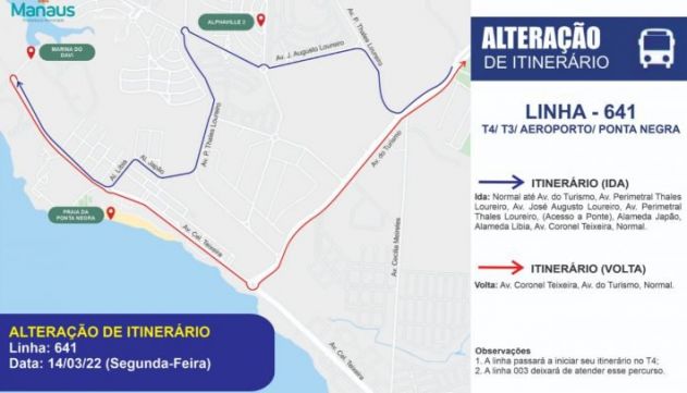 A Prefeitura de Manaus, por meio do Instituto Municipal de Mobilidade Urbana (IMMU), informa que a linha de ônibus 641, que realiza a rota aeroporto/Ponta Negra, zona Oeste, terá o itinerário alterado, a partir desta segunda-feira, 14/3.