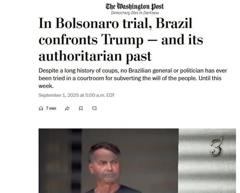 Segundo o The Post, o julgamento de Bolsonaro, aliados próximos e militares de alta patente marca uma inflexão na história política do Brasil. É a primeira vez que uma tentativa de rompimento da ordem institucional vai a julgamento. Além da tradição política, há um enfrentamento contra o presidente dos Estados Unidos, Donald Trump, que tentou coagir o julgamento com sanções contra o país e o relator do processo, o ministro Alexandre de Moraes, do Supremo Tribunal Federal (STF).