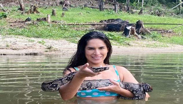 Modelo nada com jiboia em sítio de Manaus e vídeo viraliza nas redes sociais