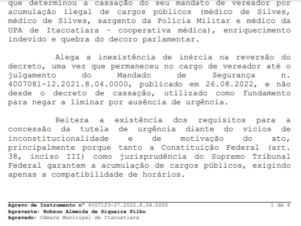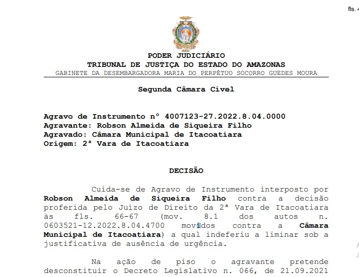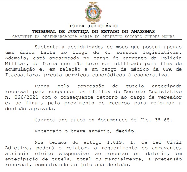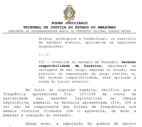 A nova decisão que suspende primeira ação por quebra de decoro por acúmulo de cargos públicos é da desembargadora Maria do Perpétuo Socorro Guedes que afirma não ter identificado prejuízos no exercício parlamentar.