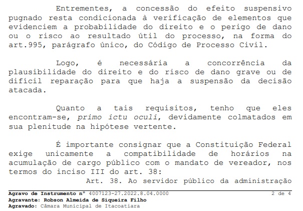 No texto da nova determinação, a magistrada afirma que tanto a Constituição Federal (art. 38, inciso III) como jurisprudência do Supremo Tribunal Federal garantem a acumulação de cargos públicos, exigindo apenas a compatibilidade de horários.