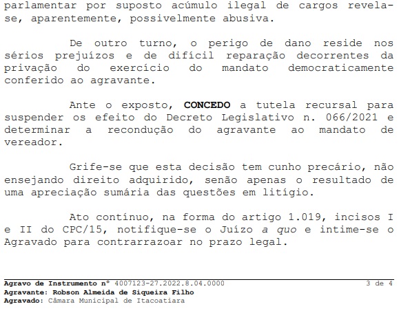 Portanto, ela conclui que vereador citado comprova frequência, com apenas uma única falta ao longo de 41 sessões legislativas e por isso, autoriza retorno de Robson ao mandato de vereador.
