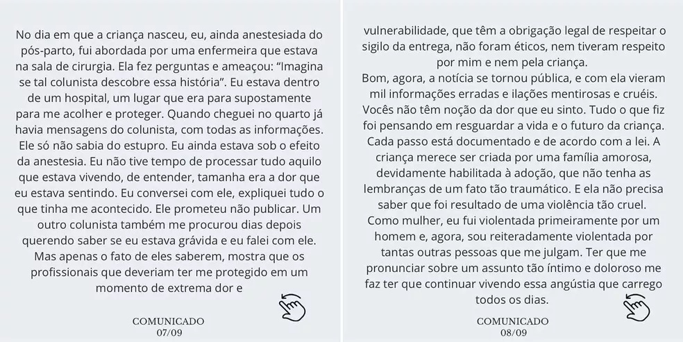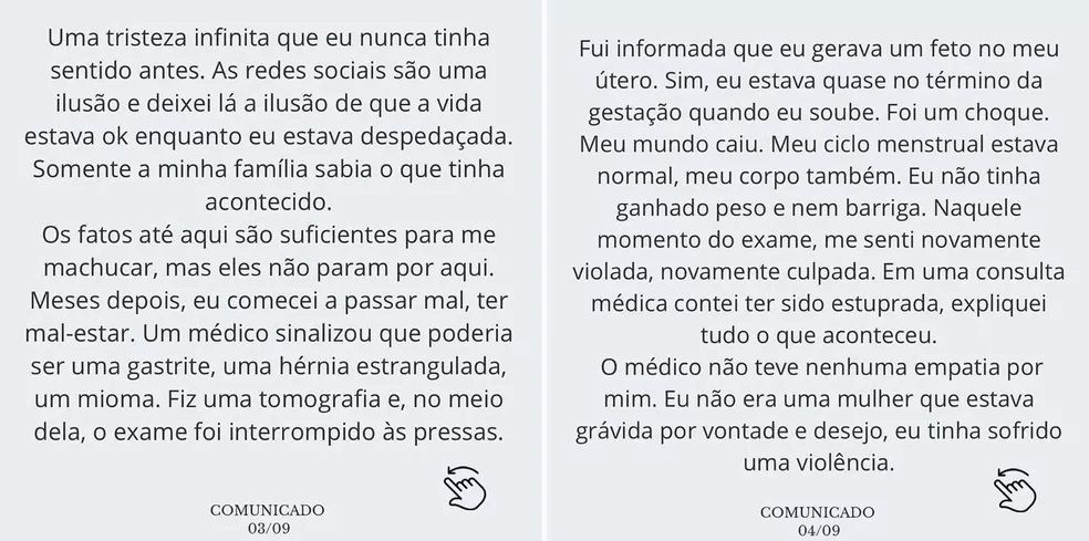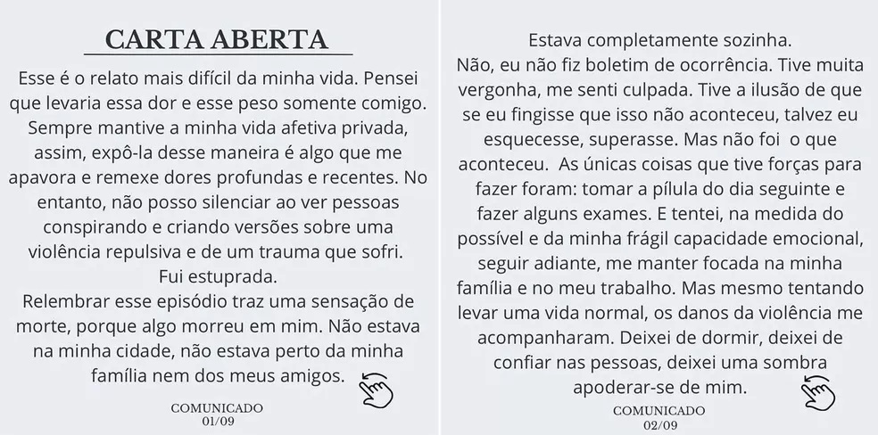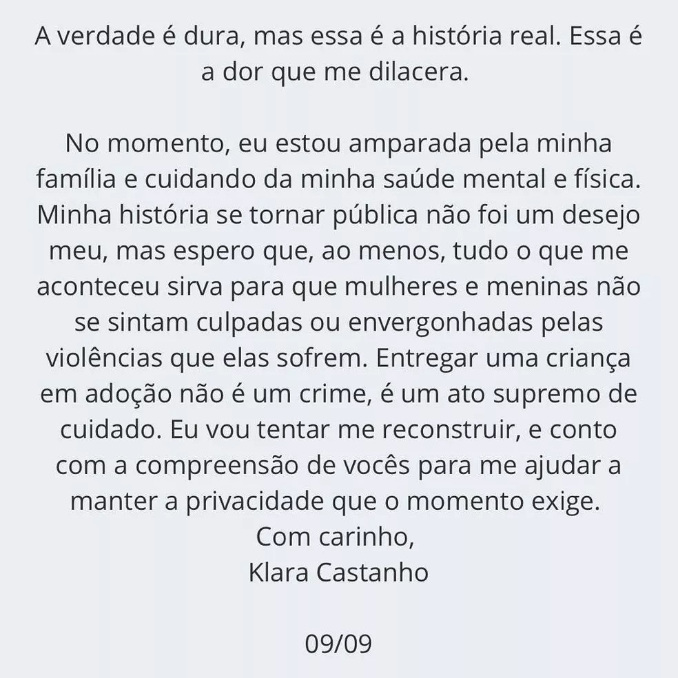 Klara escreveu uma carta aberta em que conta sobre a violência sofrida e suas consequências. "Esse é o relato mais difícil da minha vida. Pensei que levaria essa dor e esse peso somente comigo", afirma.