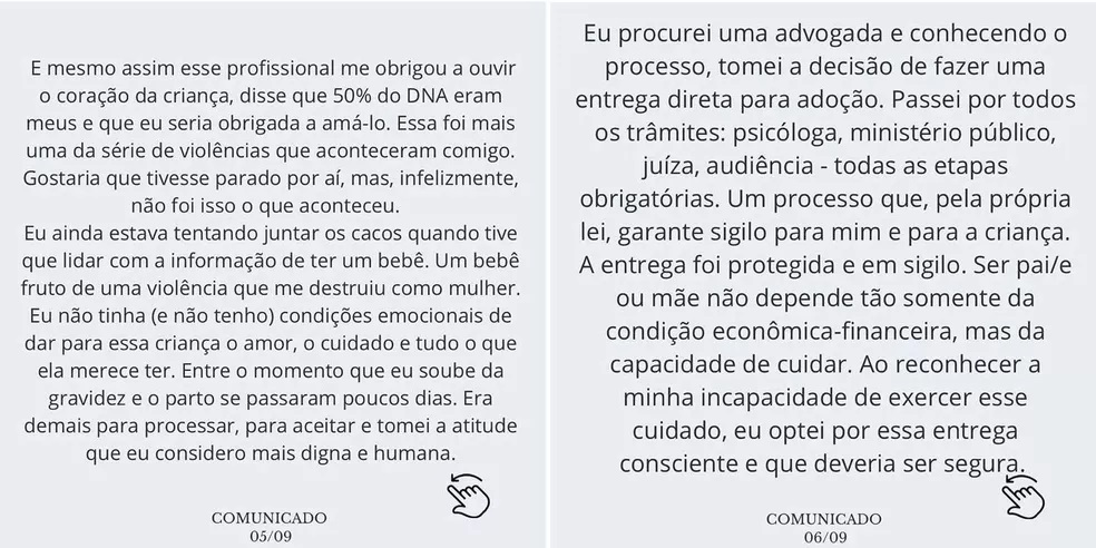 "O médico não teve nenhuma empatia por mim. Eu não era uma mulher que estava grávida por vontade e desejo, eu tinha sofrido uma violência. E mesmo assim, o profissional me obrigou a ouvir o coração da criança, disse que 50% do DNA eram meus e que eu seria obrigada a amá-lo."