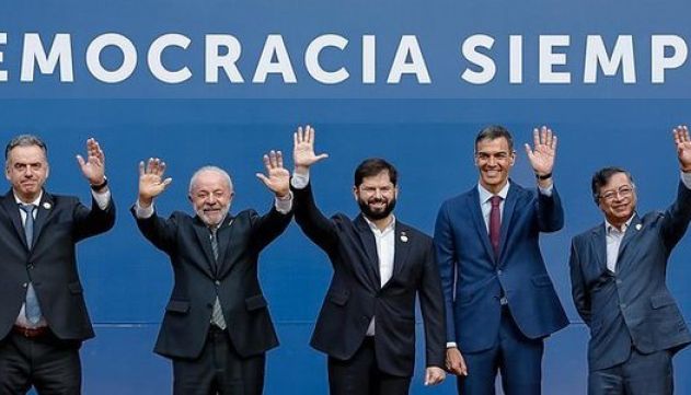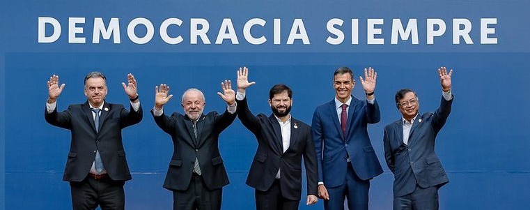 Os presidentes brasileiro, chileno, uruguaio e colombiano, e o primeiro-ministro espanhol, fizeram comunicado à imprensa na tarde desta segunda, 21/7, como parte da reunião de alto nível Democracia Sempre, realizada na capital do Chile, Santiago.