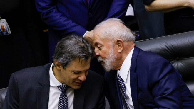 "Então, eu acho que o Haddad é um ministro extraordinário. E a segunda coisa é o arcabouço fiscal. O companheiro Haddad coordenou com o Congresso Nacional a indicação de uma seriedade administrativa estupenda. Ele convenceu todo o Governo e o Congresso Nacional de que, além de a gente cumprir o arcabouço fiscal, a gente não poderia gastar mais de 2,5% em investimentos, e isso é uma coisa extraordinária, porque foi feita contra todas as pessoas que querem investir mais. E foi aprovado no Governo e foi aprovado no Congresso Nacional", continuou.