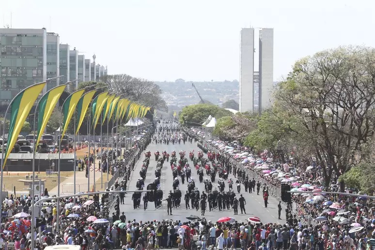 O presidente Luiz Inácio Lula da Silva participou da celebração de Sete de Setembro, o primeiro de seu novo mandato, ao lado de autoridades dos Três Poderes e a cúpula das Forças Armadas. O desfile cívico-militar que acontece na Esplanada dos Ministérios tem o tema "democracia, soberania e união", numa tentativa de desvincular a comemoração da independência do país das ameaças golpistas que marcaram a data ao longo do governo de Jair Bolsonaro. No início da cerimônia, parte do público entoou gritos de "democracia" um pouco antes da execução do Hino Nacional.