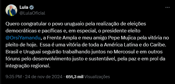 Lula também se manifestou pelas redes sociais na noite de domingo, 24/11."Quero congratular o povo uruguaio pela realização de eleições democráticas e pacíficas e, em especial, o presidente eleito Yamandú Orsi, a Frente Ampla e meu amigo Pepe Mujica pela vitória no pleito de hoje.