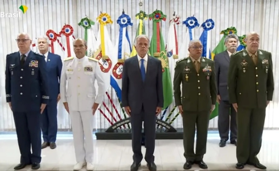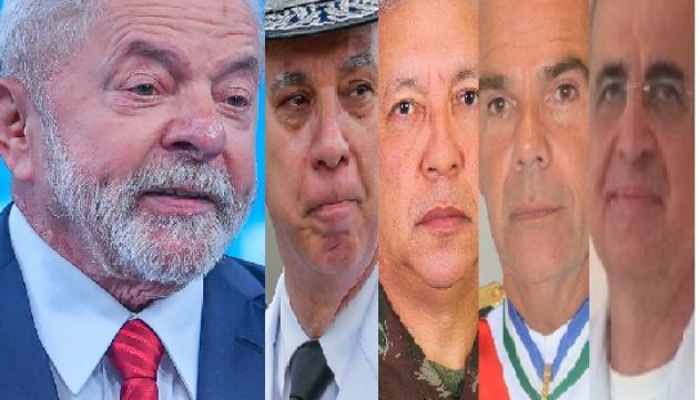 Da esq. para a dir.: Presidente Lula, Marcelo Kanitz Damasceno (Aeronáutica), Júlio Cesar de Arruda (Exército), Marcos Sampaio Olsen (Marinha) e Renato Rodrigues de Aguiar Freire (Estado-Maior).