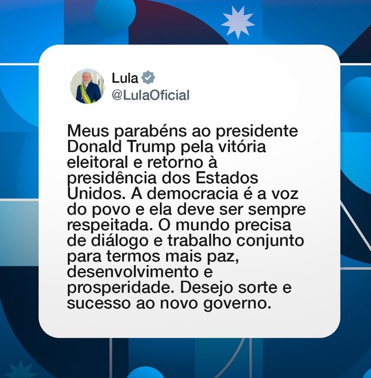 O presidente Luiz Inácio Lula da Silva publicou mensagem dirigida ao recém-eleito Donald Trump, em que reafirma a importância da democracia, do voto e do entendimento internacional pela paz.
