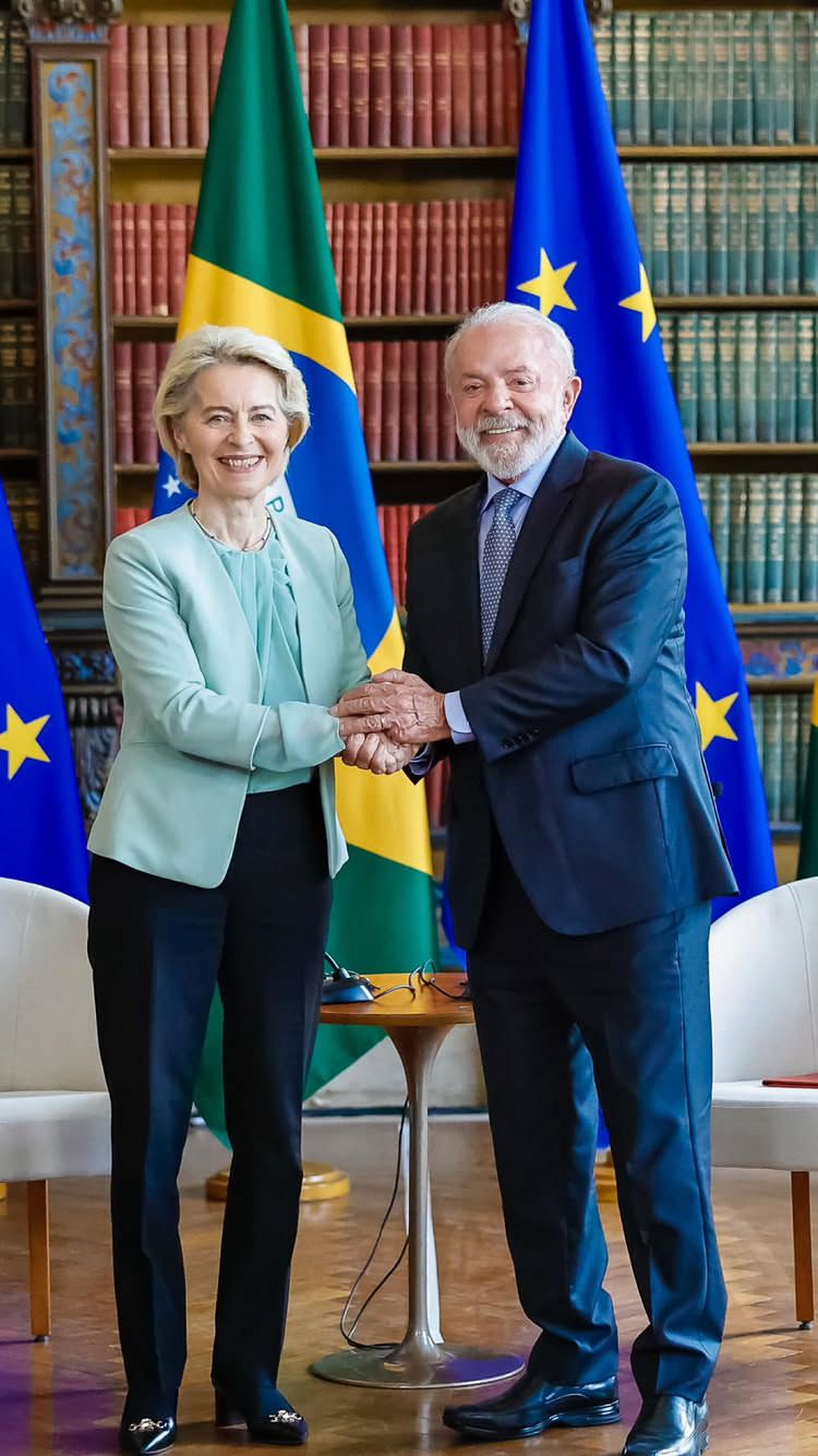 Depois do encontro com Von der Leyen, eles fizeram um pronunciamento conjunto no qual Lula destacou que os benefícios do acerto são uma clara declaração de apoio às relações multilaterais — claro contraponto ao que vem pregando internacionalmente o governo de Donald Trump. "O acordo que será assinado amanhã (hoje) em Assunção, no Paraguai, é bom para o Brasil, é bom para o Mercosul, é bom para a Europa e é muito bom, sobretudo, para o mundo democrático e para o multilateralismo. A UE e o Mercosul compartilham valores como o respeito à democracia, ao Estado de Direito e aos direitos humanos. Mais diálogo político e mais cooperação vão garantir padrões elevados de respeito aos direitos trabalhistas e a defesa do meio ambiente", frisou.