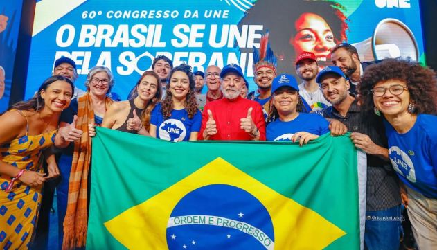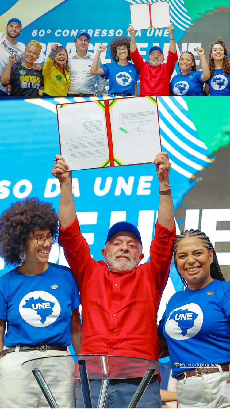 "Hoje estive no Congresso da UNE, ao lado da juventude que luta por um Brasil mais justo e com mais oportunidades. E levei uma boa notícia: sancionamos uma lei que vai garantir recursos para a assistência estudantil", escreveu Lula em sua rede social. "Agora, parte do dinheiro proveniente do petróleo e gás natural brasileiros será investido para que estudantes de baixa renda tenham acesso à alimentação, moradia, transporte, inclusão digital e saúde nas universidades e institutos federais", prosseguiu.