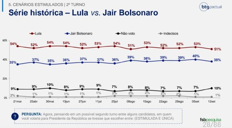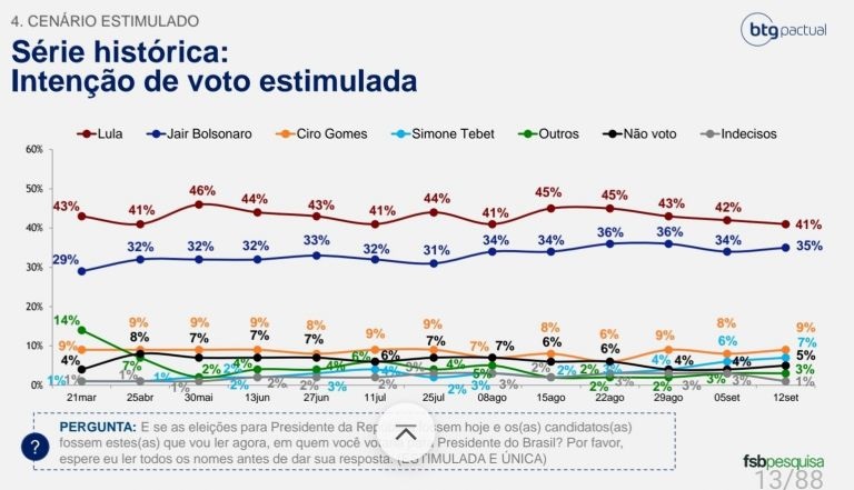 Pesquisa presidencial FSB/BTG, realizada entre os dias 09 e 11/09 aponta o ex-presidente Luiz Inácio Lula da Silva (PT) com 42% das intenções de votos. A seguir vem o presidente Jair Bolsonaro (PL) com 35% dos votos.