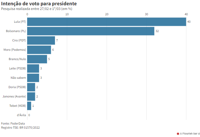O ex-presidente Lula (PT) tem 40% das intenções de voto no 1º turno para a Presidência da República. Em segundo lugar está o atual presidente Jair Bolsonaro , com 32%. Os dados são da última pesquisa PoderData, realizada entre 27 de fevereiro e 1º de março de 2022.