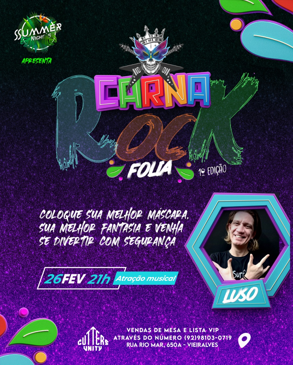 Este ano, Luso traz a criatividade inata e mostra o seu CarnaRockFolia, uma festa de carnaval regada de clássicos misturados ao rock’n roll. A festa, que será realizada pela primeira vez em Manaus terá, além de muita música, sorteios de melhor máscara e melhor fantasia, com prêmios para ambos.