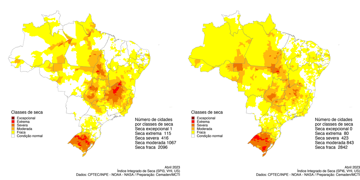 O levantamento ainda mostra que mais de 2 mil municípios estão há pelo menos dois meses sem chuvas. O órgão entende que o Brasil enfrenta a maior seca das últimas décadas. Os dados foram compilados até domingo (22).