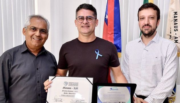 O prefeito David Almeida recebeu, nesta sexta-feira, 18/11, uma placa de homenagem da empresa Águas de Manaus, em reconhecimento a Manaus, que se destacou como a capital que mais investiu em saneamento básico das regiões Norte e Nordeste nos últimos anos. Ao todo, mais de R$ 600 milhões foram injetados em serviços de água e esgotamento sanitário.