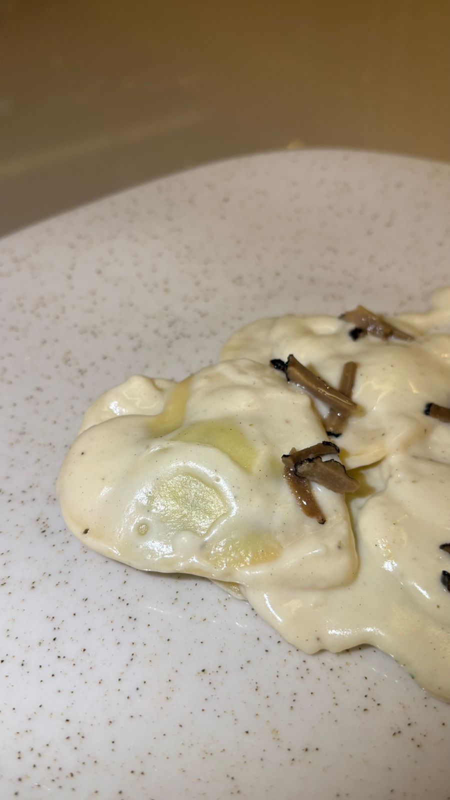 - Ravioli verde com ricota de búfala, espinafre e trufa negra.