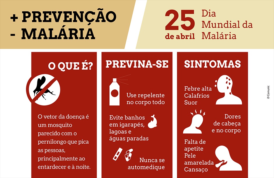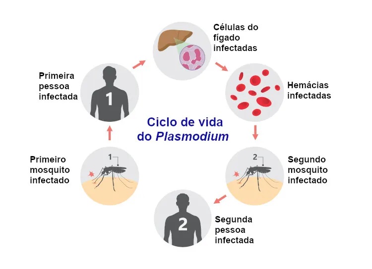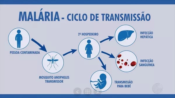 A malária é uma doença infecciosa febril aguda, causada por protozoários do tipo plasmodium, transmitidos pela picada da fêmea infectada do mosquito Anopheles. Além de febre alta, o paciente pode apresentar sintomas como calafrios, tremores, sudorese (suor excessivo) e dor de cabeça, e em alguns casos podem surgir náuseas, vômitos, cansaço e falta de apetite.