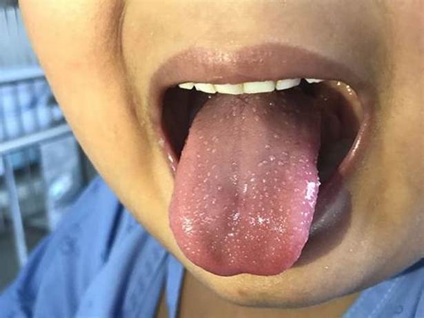 Além das manchas e da língua “framboesa”, o quadro pode incluir eventualmente febre alta e dor de garganta.