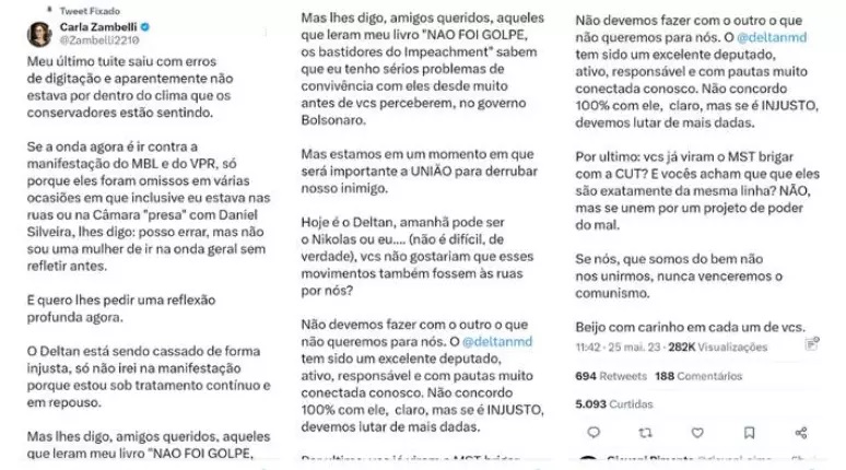 Ao Estadão, o ex-secretário de Comunicação Social de Bolsonaro confirmou que a crítica foi direcionada à manifestação do 4 de junho e à deputada Carla Zambelli (PL-SP), que chamou seguidores para o ato. Na quinta-feira, à tarde, ela publicou uma retratação, voltando atrás e apelando aos seguidores a favor de Dallagnol. "Hoje é o Deltan, amanhã pode ser o Nikolas (Ferreira) ou eu.... (não é difícil, de verdade). Vocês não gostariam que esses movimentos também fossem às ruas por nós?", disse ela.