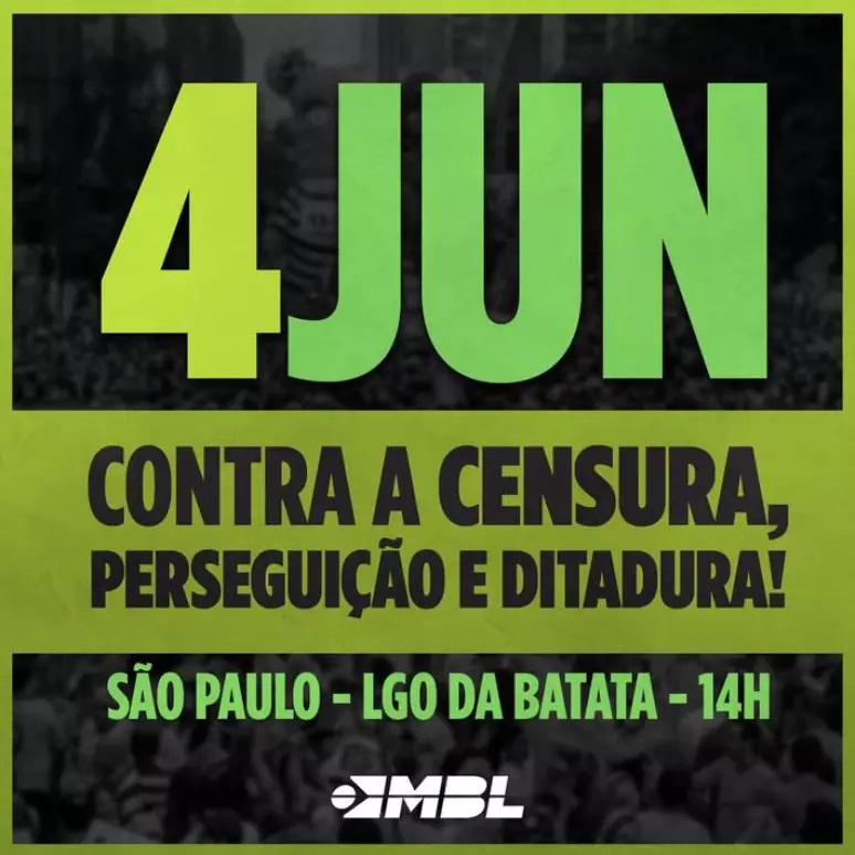 Ao Estadão, o MBL confirmou que a manifestação do dia 4 de junho está mantida. O grupo decidiu nesta sexta-feira, 26, mudar o local. Do vão do Masp, que fica na Avenida Paulista, o ato agora será no Largo da Batata, em Pinheiros, na zona oeste da capital paulista.