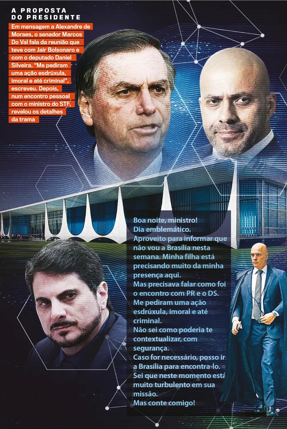 No dia 14 de dezembro, na data agendada pelo ministro para o encontro com o senador, o Supremo Tribunal Federal julgava a legalidade do chamado orçamento secreto. No intervalo da sessão, Alexandre Moraes deixou o plenário e, de toga, foi até o salão branco do prédio, onde Marcos do Val já o aguardava, conforme o combinado. A conversa foi rápida, durou apenas alguns minutos. O parlamentar narrou detalhes do encontro que teve com o presidente, da proposta indecorosa que recebeu e os objetivos abjetos do plano. Acostumado nos últimos tempos a lidar com as mais mirabolantes teorias da conspiração, Moraes fez um único comentário: “Não acredito”, disse em tom de espanto. À noite, depois de relatar o caso ao ministro e convicto de que estava se envolvendo em algo perigoso, Do Val finalmente respondeu às mensagens de Daniel Silveira. “Irmão, vou declinar da missão”, escreveu, sem dar maiores explicações. O deputado assentiu: “Entendo, obrigado”.