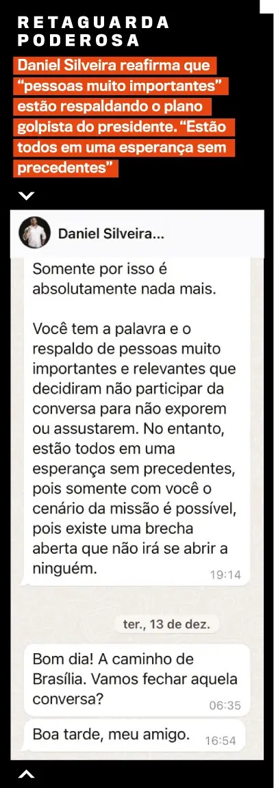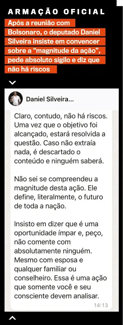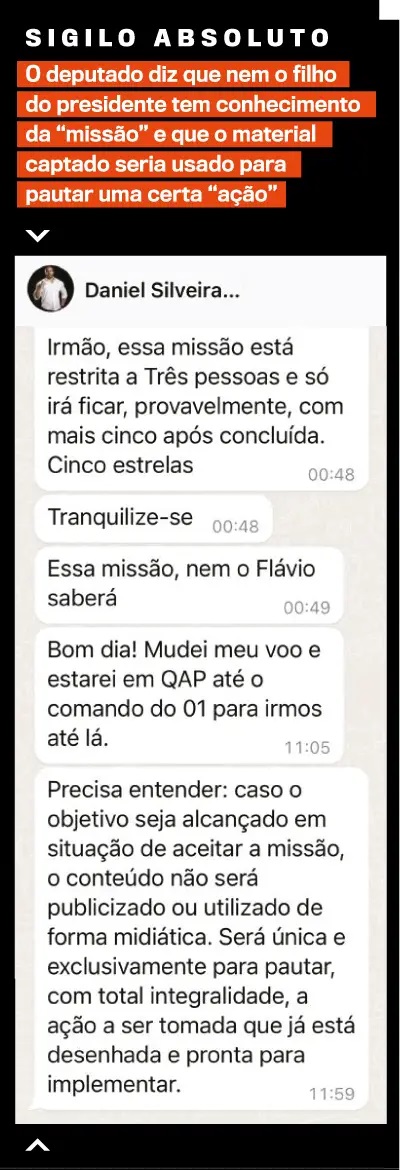 No dia seguinte à reunião, Silveira enviou uma série de mensagens ao senador cobrando uma resposta. Na primeira delas, reafirmou que Do Val poderia ficar tranquilo, que a missão era segura. Repetiu que apenas três pessoas sabiam do plano, e outras duas tomariam conhecimento apenas após a conclusão da primeira etapa da operação – “cinco estrelas”, destacou, fazendo supor que os dois personagens ocultos seriam militares. O deputado reforçou que a coisa toda era tão sigilosa que “nem o Flávio saberá”, se referindo ao filho do presidente, Flávio Bolsonaro. “Estarei em QAP até o comando do 01 para irmos até lá”, acrescentou. No jargão policial, QAP significa “na escuta”, de “prontidão”. Por último, Silveira lembrou que “o conteúdo” captado seria utilizado exclusivamente para pautar a “ação” que já estaria “desenhada e pronta para ser implementada”. O senador não respondeu.